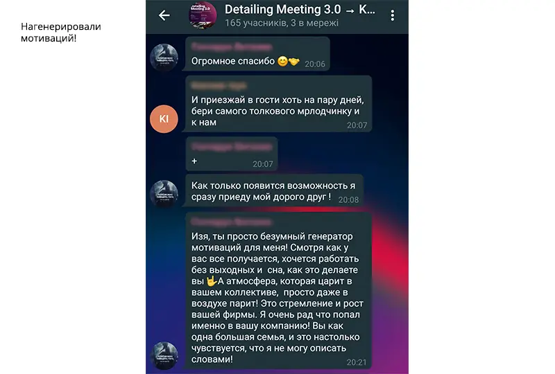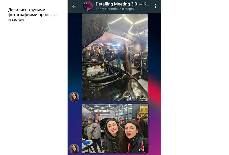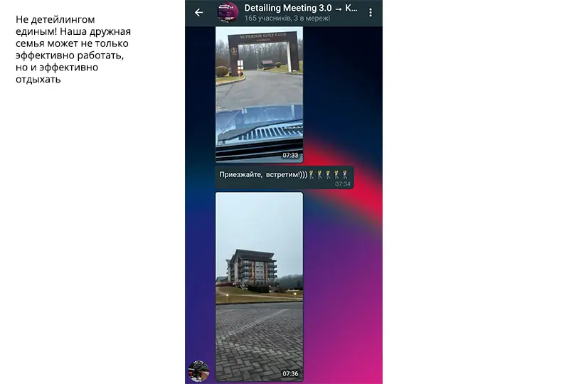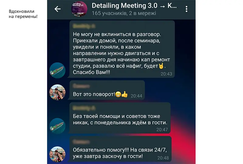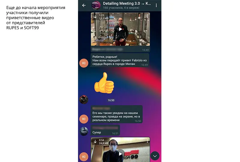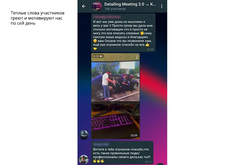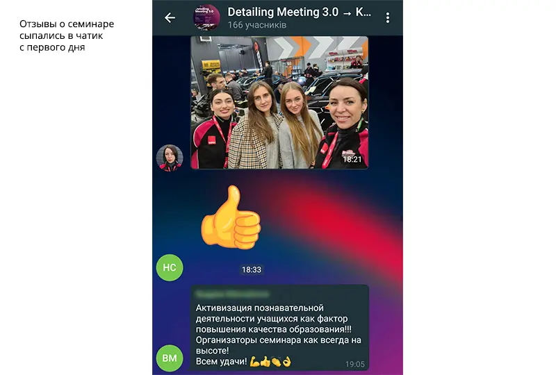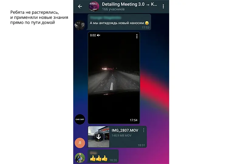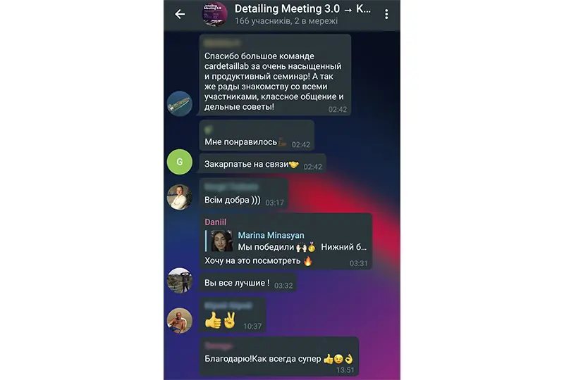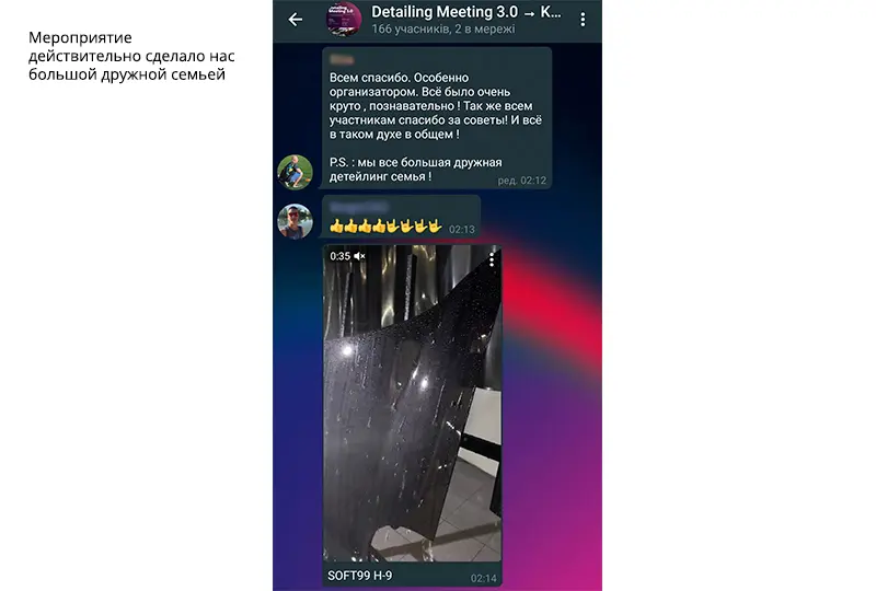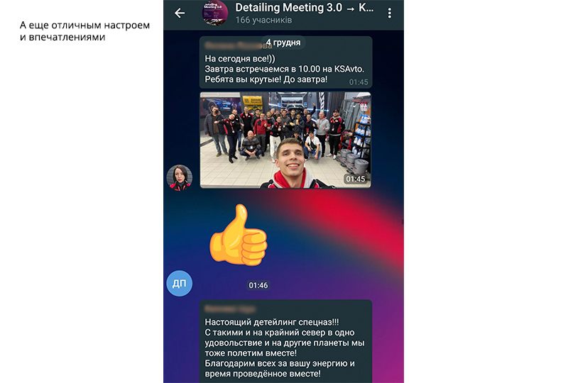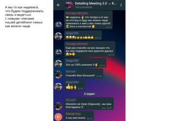 Был повод убедиться, что атмосфера в нашем онлайн-сообществе автодетейлеров с каждым новым мероприятием становится все более теплой и дружеской. Мы добавили ребят в существующую группу участников Detailing Meeting 2.0 в Телеграм. Это закрытый групповой чат с эксклюзивной библиотекой полезных медиафайлов: ссылок, документов, презентаций, обучающих фото и видео. Приоткрываем его для вас: