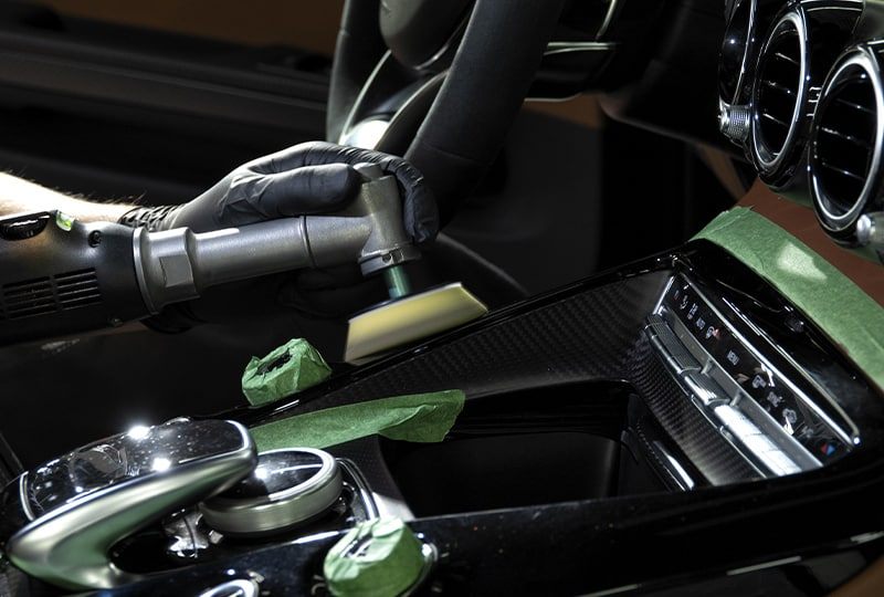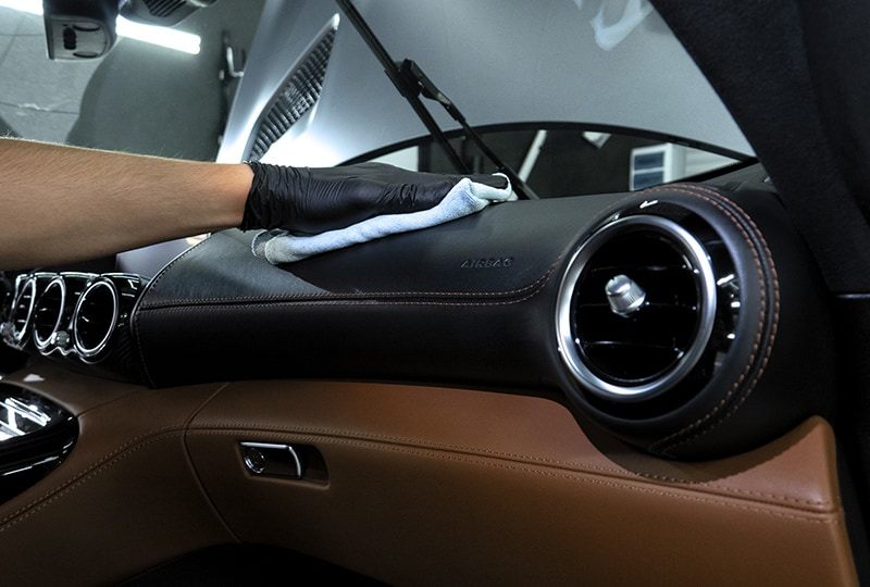 Для придания интерьеру салона идеального внешнего вида, мы пропитали кожу защитным составом G’zox Detailing Pro, а элементы салона отполировали.