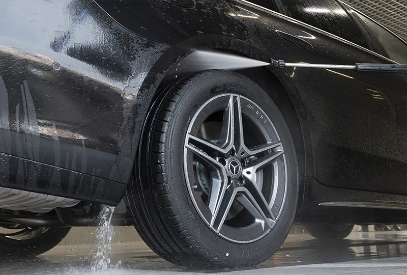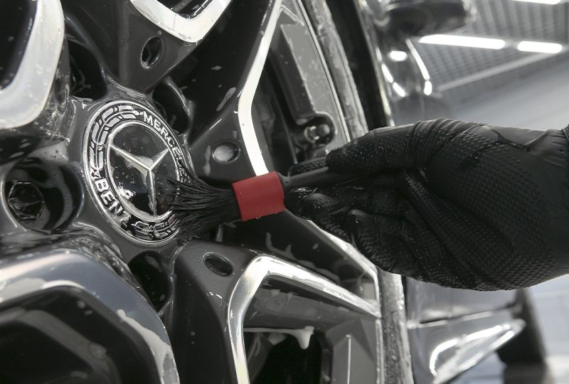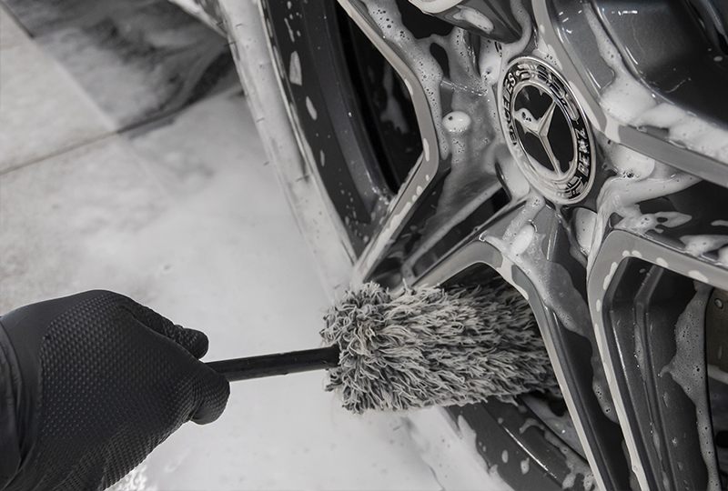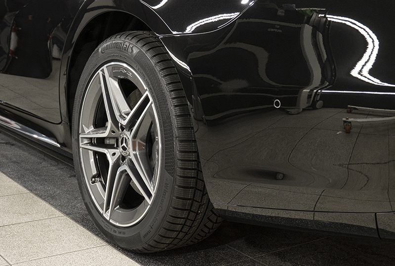 Автомобиль ехал в нашу студию сразу из салона Mercedes-Benz в Киеве. В дороге его подстерегало немало опасностей. На кузове и колесах появились статические загрязнения: следы битума, гудрона и мелкого песка. Также на ЛКП и дисках образовались въевшиеся загрязнения в виде металлической стружки и частиц тормозных колодок. Первым делом, мы полностью очистили авто от видимой грязи, убрали статику.
