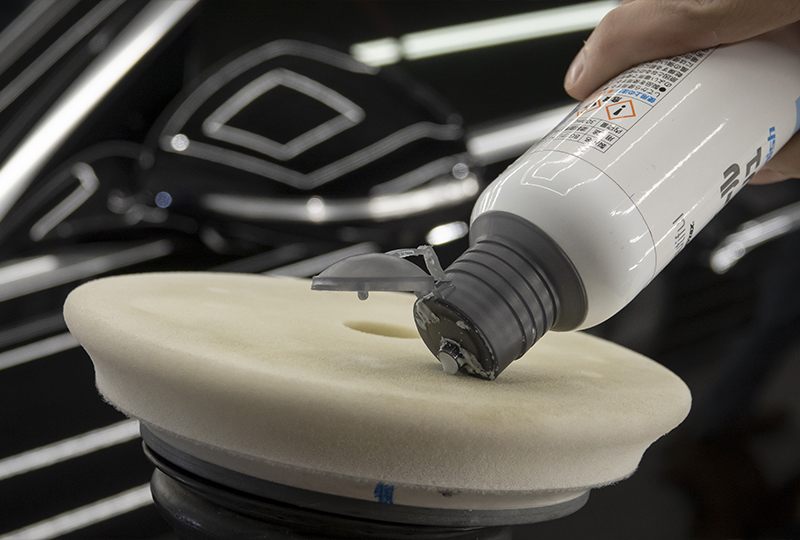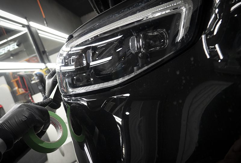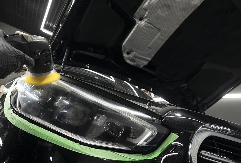 Перед защитой кузова кварцем, мы отполировали ЛКП белым ультрамягким кругом. А еще подготовили фары, используя чуть более жесткий, желтый круг.