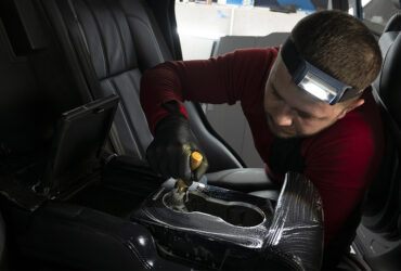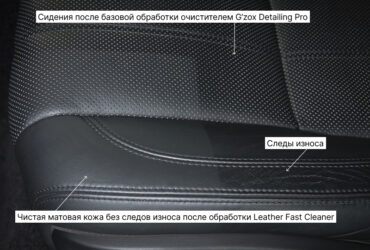 Первым делом занялись очисткой элементов салона из натуральной кожи. В студиях наших партнеров для этой задачи используют комплекс G’zox Detailing Pro. Он увлажняет и размягчает кожу, увеличивая ее эластичность и продлевая срок службы. Дополнительно очистили кожу от жира, грязи и старых въевшихся пятен средством Leather Fast Cleaner. Его состав не сушит, не смывает краску и не портит защитный полиуретановый слой. А еще защищает кожу от преждевременного износа.