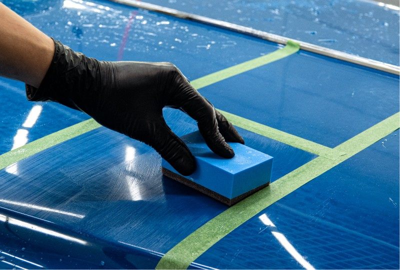 Ребята практиковались на тестовых панелях, потому что обучать шлифовке на клиентских автомобилях опасно и они должны понимать когда образуется пропил. Так они смогли поработать с разными абразивами и понять, когда нужно остановиться.