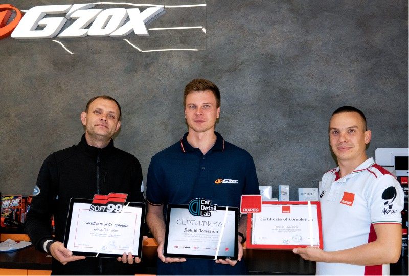 После прохождения каждого из модулей мы проводили аттестацию для проверки усвоенного материала. После успешной аттестации по модулям «Продвинутая полировка» и «Очищающие и защитные составы» студенты получили сертификаты RUPES и SOFT99. В конце обучения ребятам выдали сертификаты об окончании тренинг-центра CarDetailLab.