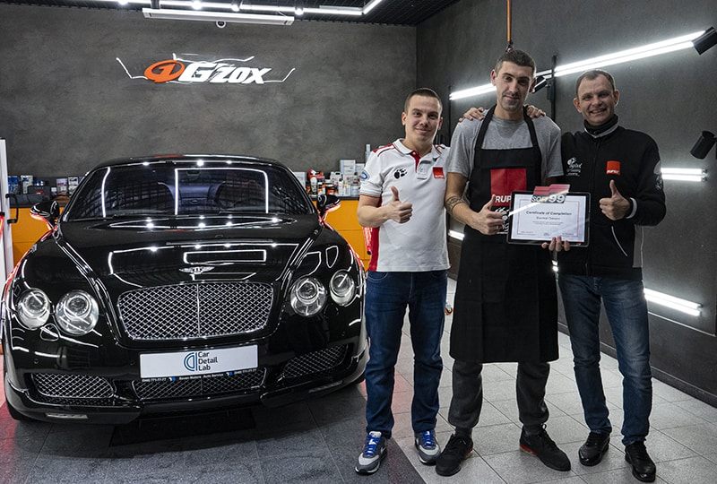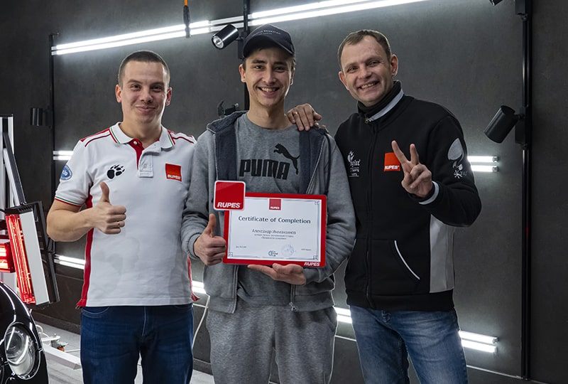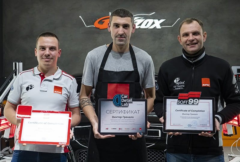 После прохождения модулей мы провели аттестацию для проверки усвоенного материала. После успешной аттестации по модулям «Продвинутая полировка» и «Очищающие и защитные составы» студенты получили сертификаты RUPES и SOFT99. В конце обучения ребятам выдали сертификаты об окончании тренинг-центра CarDetailLab.