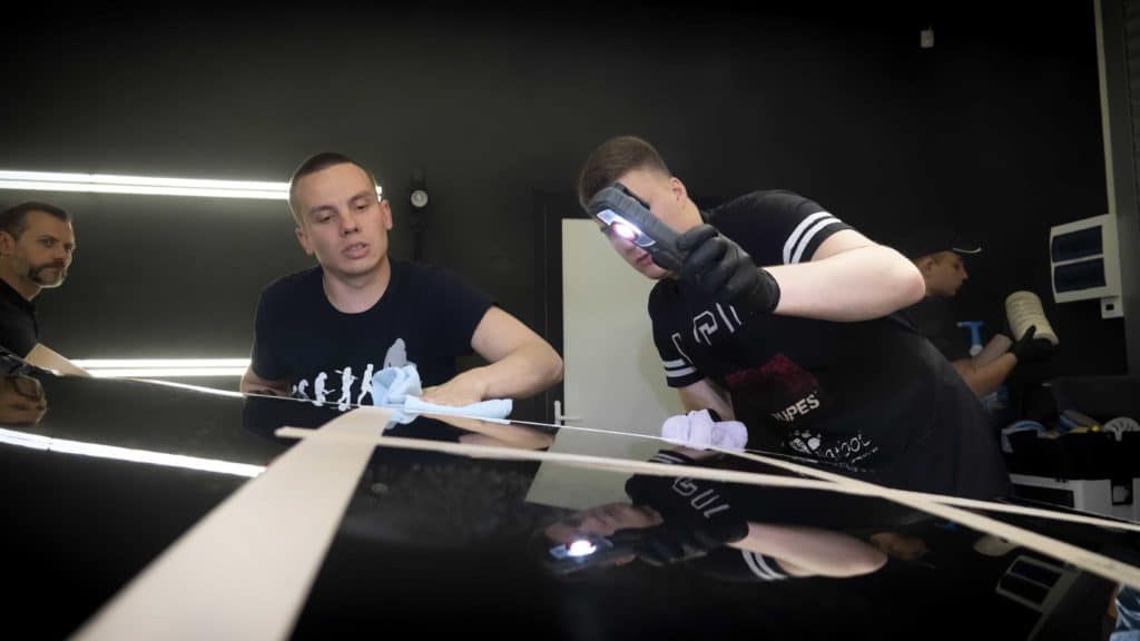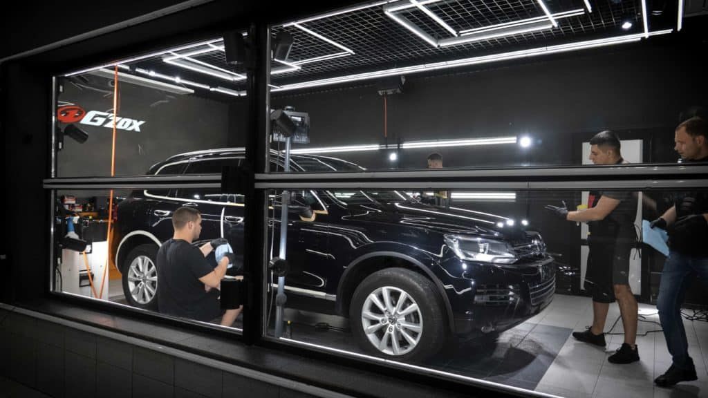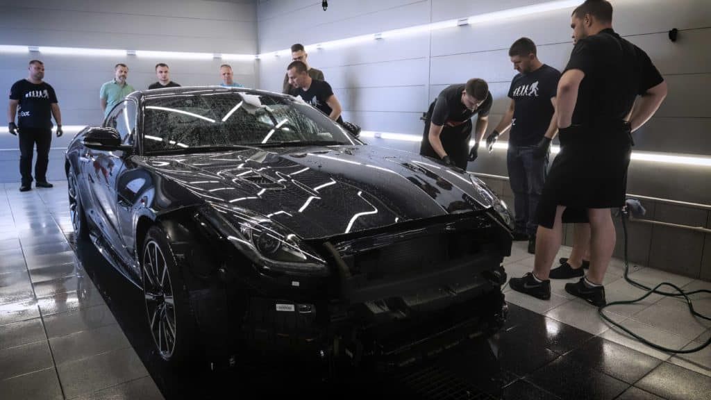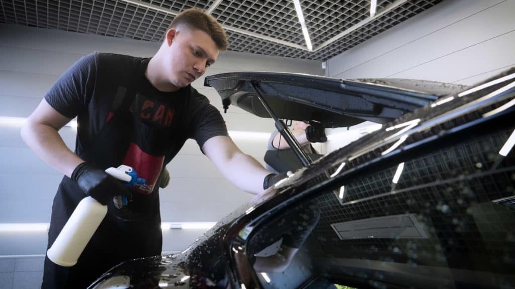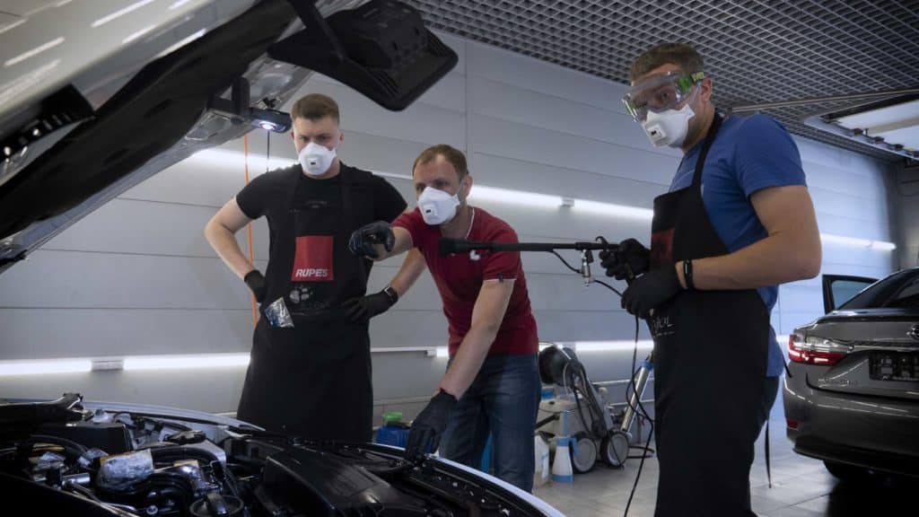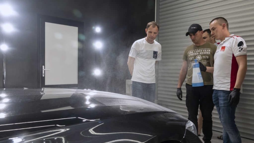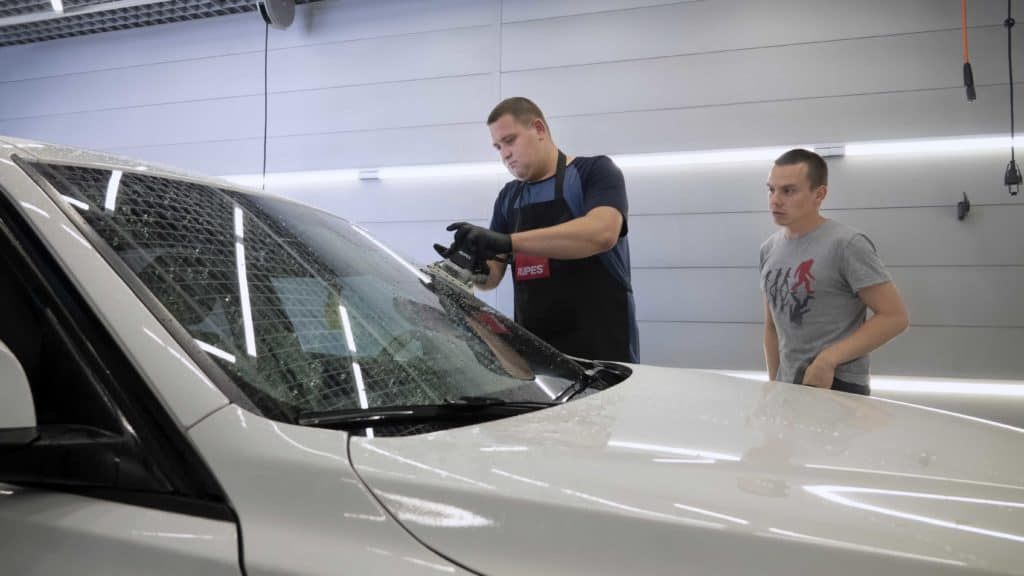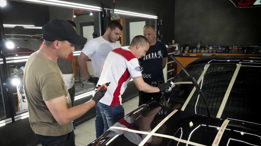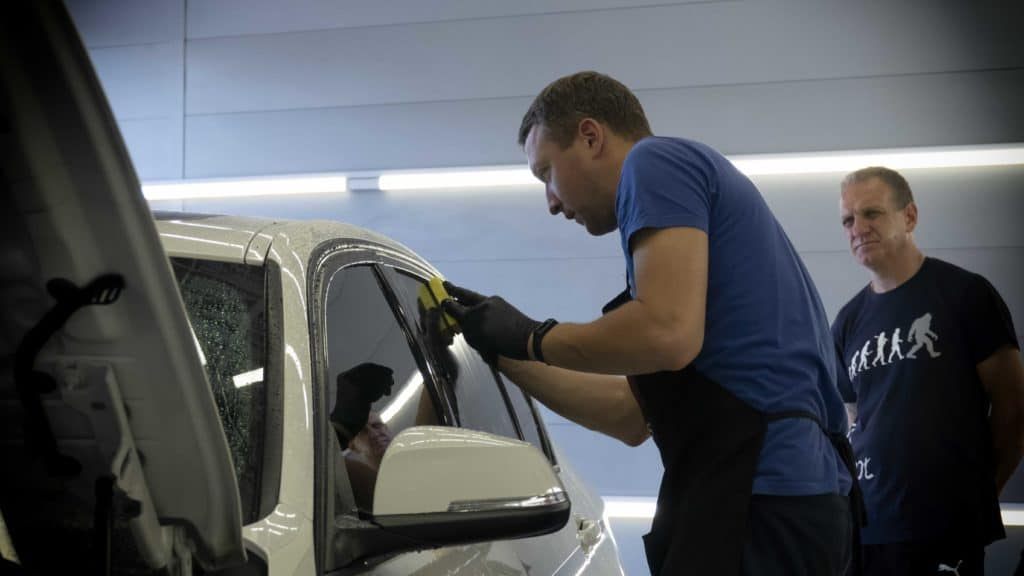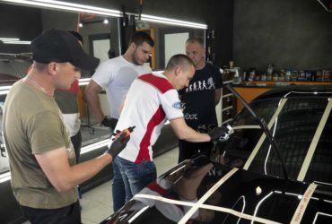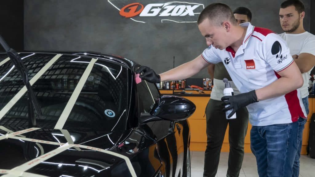 Одна из частей модуля о защитных составах посвящена работе с покрытиями для стекол «антидождь». Студенты учатся глубокой очистке стекол и нанесению различных типов «антидождей».