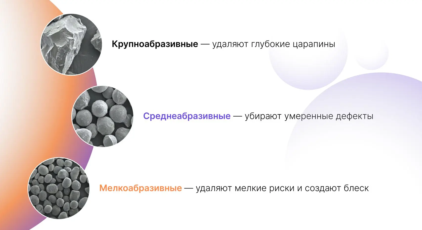 Крупноабразивные (режущие) используются для удаления глубоких царапин, окисления и следов шлифовки.