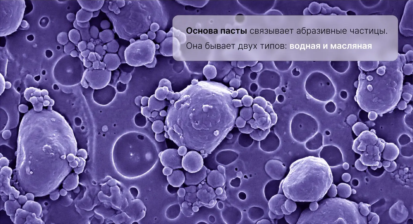 Масляная основа. Абразив в ней дольше остается рабочим, что полезно при длительной резке твёрдых лаков. Однако такие пасты требуют тщательного обезжиривания, чтобы убедиться, что царапины удалены, а не просто заполнены маслом.