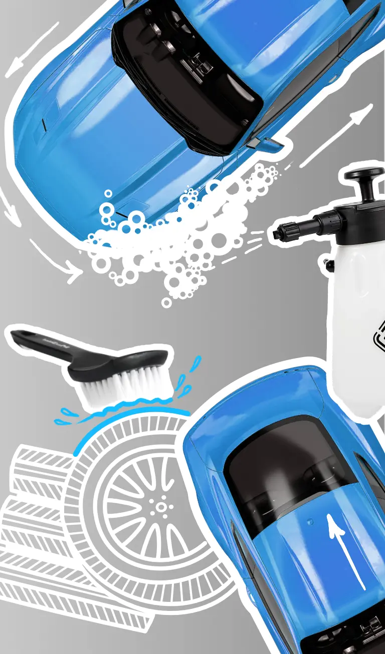 После кузова начинается мойка труднодоступных мест: колес, колесных арок, радиаторной решетки, резиновых уплотнителей и значков. Очистка каждой зоны занимает несколько минут, поэтому наносить пену нужно поочередно. Для очистки используются специальные щетки и кисти.