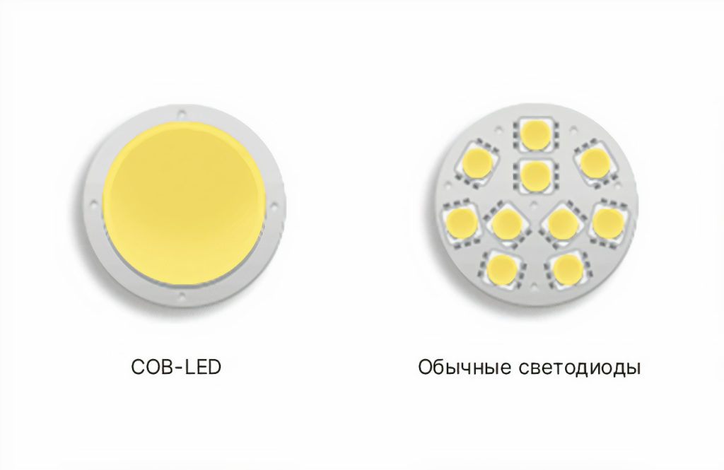 - Завдяки суцільному кріпленню лампи COB-LED освітлюють поверхню в 10 разів сильніше, ніж SMD-LED