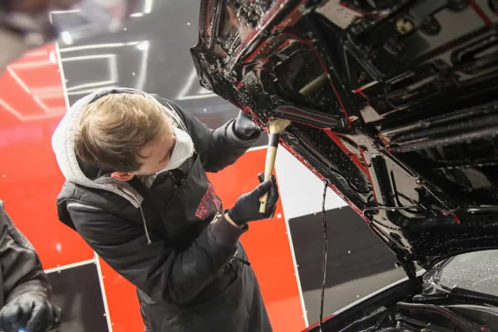 - Встряхнуть баллон и нанести средство на наружные поверхности подкапотного пространства.