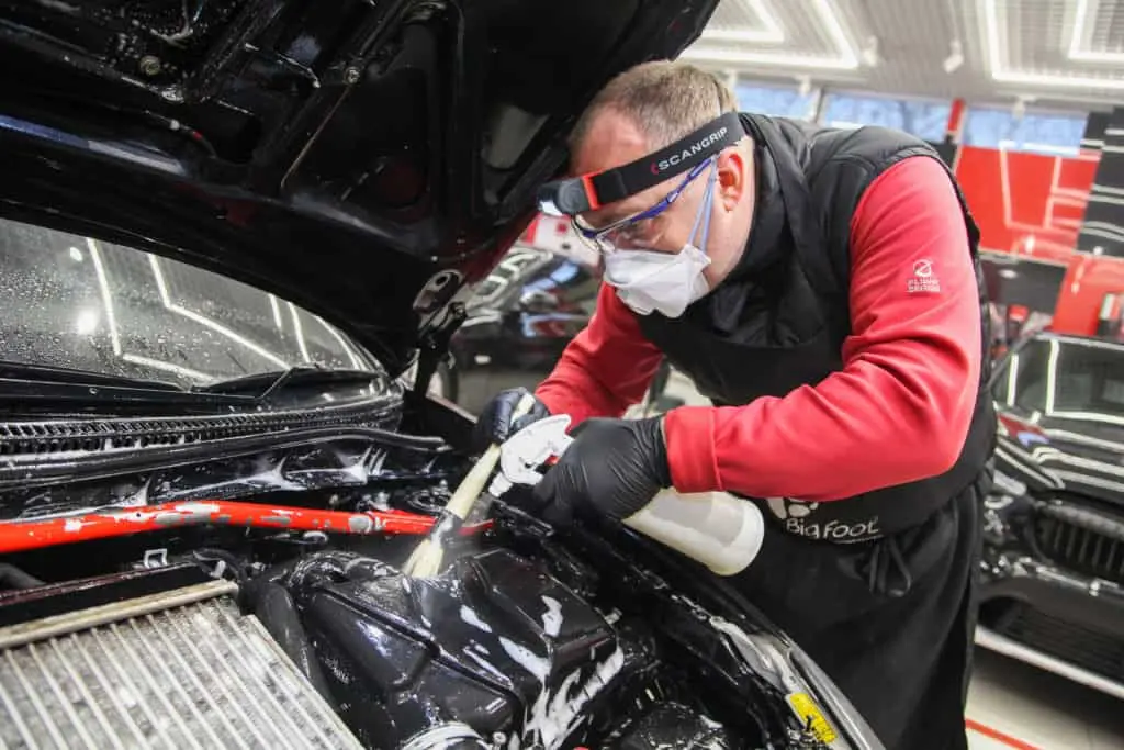 Для мойки подкапотного пространства не подходит жидкость для бесконтактной мойки. Нужна специальная химия, которая отмывает пятна масла и других технических жидкостей, не портит пластик и резину, а также обладает диэлектрическими и гидрофобными свойствами, чтобы не навредить электрике автомобиля.