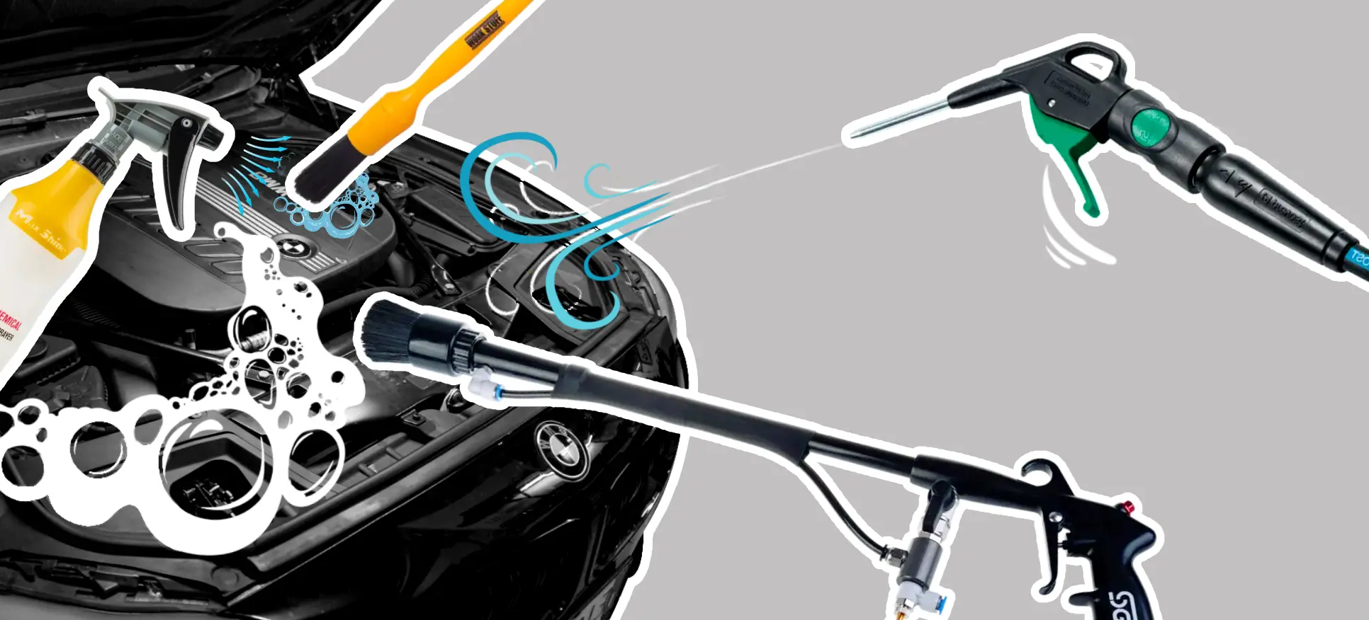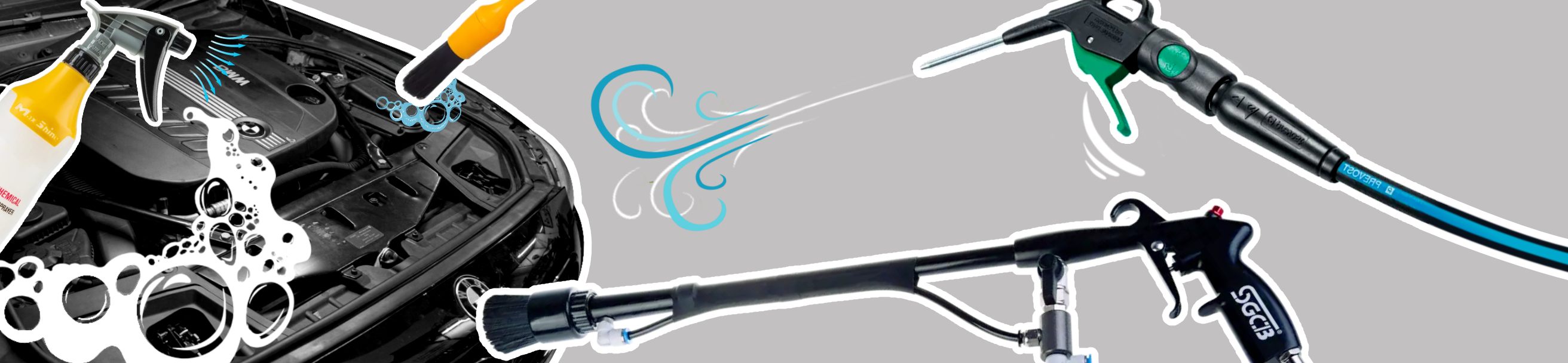 Пневмопистолет с эффектом торнадо (в среде мойщиков и детейлеров «торнадор»). Торнадор — это аппарат, который смешивает химию с воздухом и выбрасывает её под большим давлением. Торнадор разбивает чистящее средство на мелкие частицы, благодаря чему оно проникает в любые щели и зазоры подкапотного пространства. При этом торнадор выдает очень маленький объем воды, которым намного сложнее залить важные детали.