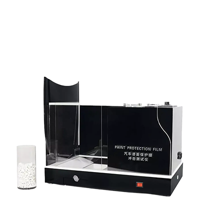 Стенд для проверки ударопрочности — это наглядный способ продемонстрировать, как работает защитная плёнка. Тестовую панель-капот оклеивают PPF, помещают в установку, где на поверхность сыплется мелкий щебень, имитируя камни, которые летят из-под колёс на скорости. Такой тест чётко показывает, насколько хорошо плёнка защищает от сколов и повреждений.