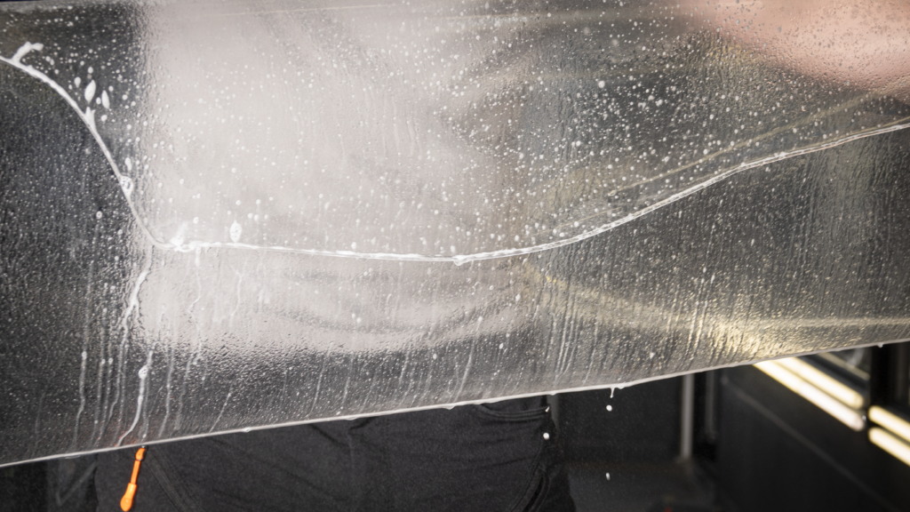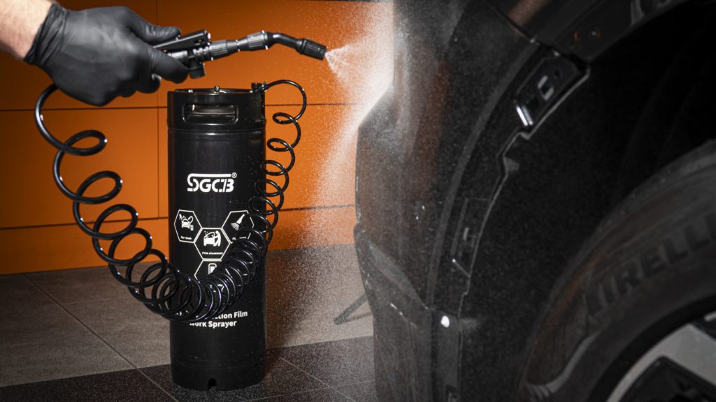 Один из незаменимых инструментов при работе с PPF — распылитель. Он равномерно наносит мыльный раствор на кузов, что обеспечивает идеальное скольжение плёнки и уменьшает риск образования заломов и пузырей.