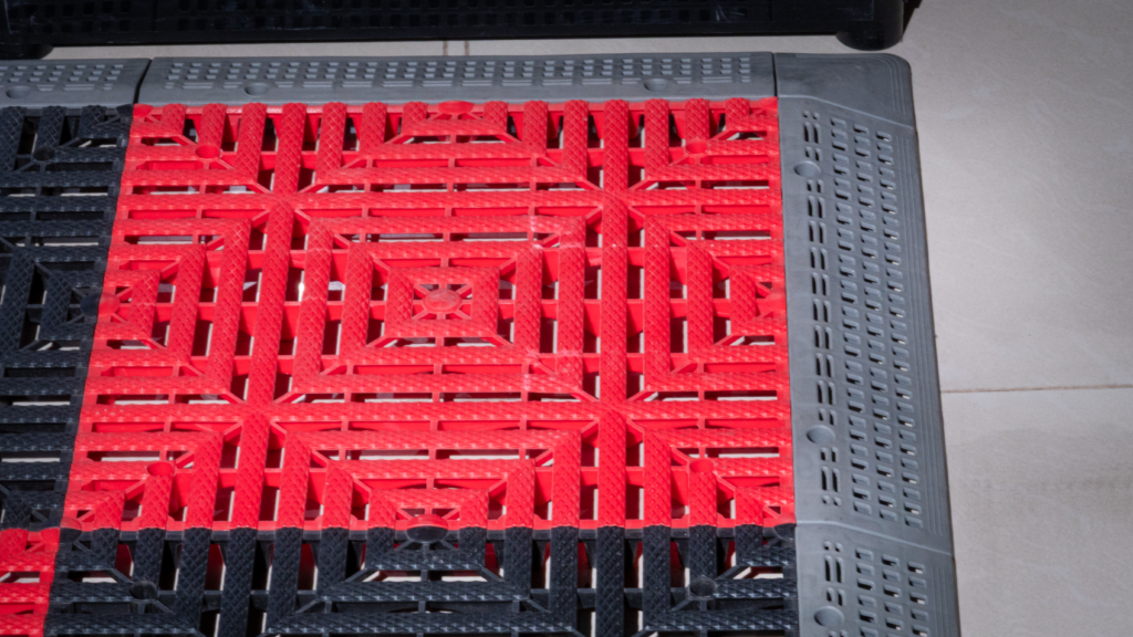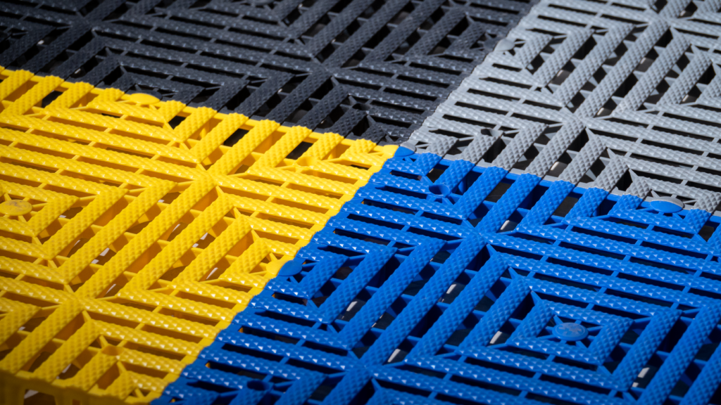 - Модульный пол из полипропилена выдерживает нагрузку до 10 000 кг/м²