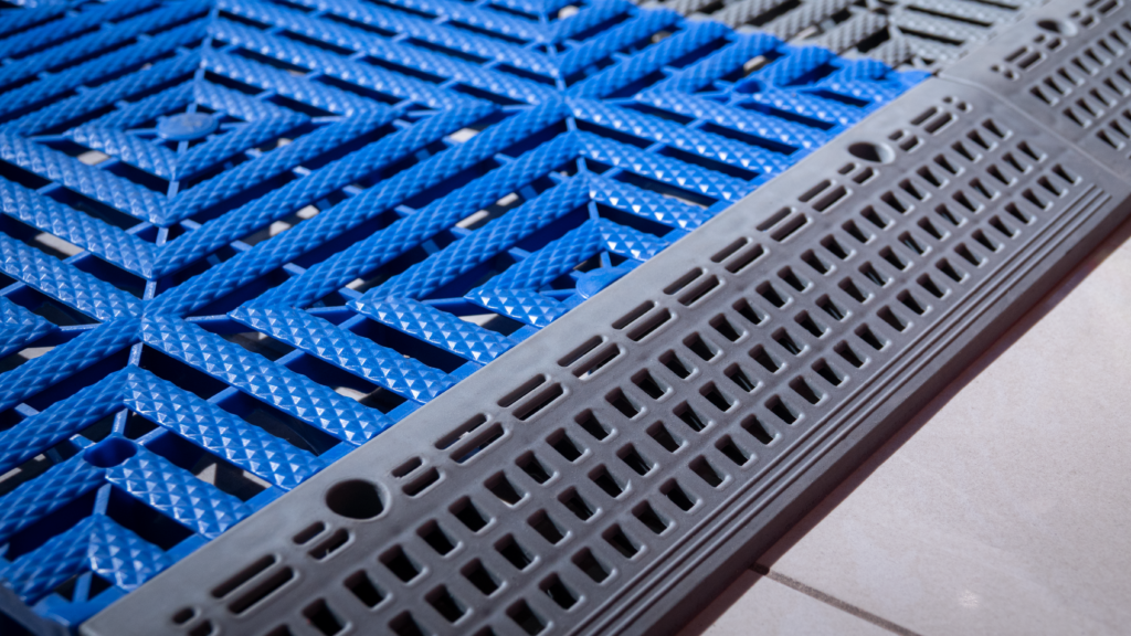 Первое, с чего стоит начать — это покрытие пола. Модульный пол из полипропилена с дренажной структурой предотвращает скопление воды и грязи и выдерживает нагрузку до 10 000 кг/м². Он нескользкий, устойчив к агрессивной химии и легко моется. Плитки разных цветов можно использовать для зонирования пространства: мойка, подготовка, поклейка.