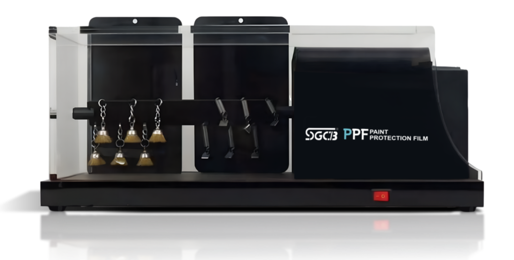 Стенд для проверки ударопрочности — это наглядный способ продемонстрировать, как работает защитная плёнка. Тестовую панель-капот оклеивают PPF, помещают в установку, где на поверхность сыплется мелкий щебень, имитируя камни, которые летят из-под колёс на скорости. Такой тест чётко показывает, насколько хорошо плёнка защищает от сколов и повреждений.
