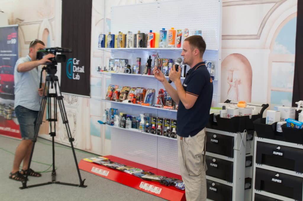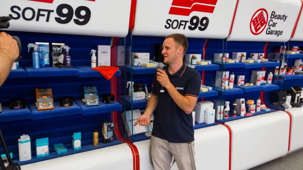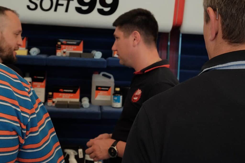 Стена справа от зрительских мест была занята стендами с продукцией SOFT99: очистителями, восками, защитными агентами, гидрофобными покрытиями и кварцевыми защитными составами. Чтобы гости не растерялись в огромном количестве позиций, мы провели подробно рассказали о каждой группе товаров. После этого гости продолжили изучение позиций самостоятельно, с помощью коллег и консультантов SOFT99.