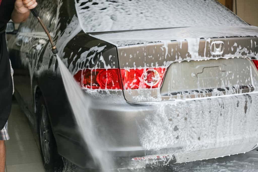 Як правильно помити автомобільСпочатку струменем з АВТ з кузова машини збивається засохлі грудки вікового бруду, потім на нього наноситься піна. Але тут мийники використовують щадний для ЛФП низьколужний шампунь і швидко його змивають, щоб він не встиг пошкодити лак і фарбу. Якщо на кузові залишився бруд, процес повторюють ще раз.