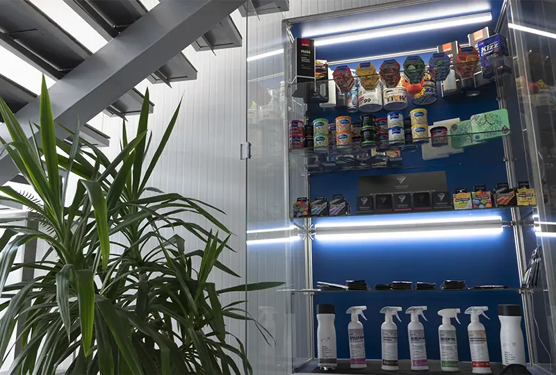 Студія працює тільки з найкращими брендами в індустрії детейлінгу: полірувальні, шліфувальні та пиловидаляючі системи RUPES, преміальна японська лінійка автокосметики SOFT99, системи подачі повітря Prevost, професійне світлове обладнання Scangrip.