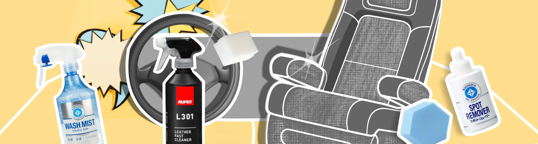 Пил, дрібні крихти та сліди від пальців легко видаляються за допомогою очисника тканини SOFT99 Fabric Seat & Mat Cleaner. Для плям від кави, кетчупу чи шоколаду підійде плямовивідник SOFT99 Roompia Spot Remover. Якщо жоден засіб не допоміг — це вже привід звернутися до професійної хімчистки.