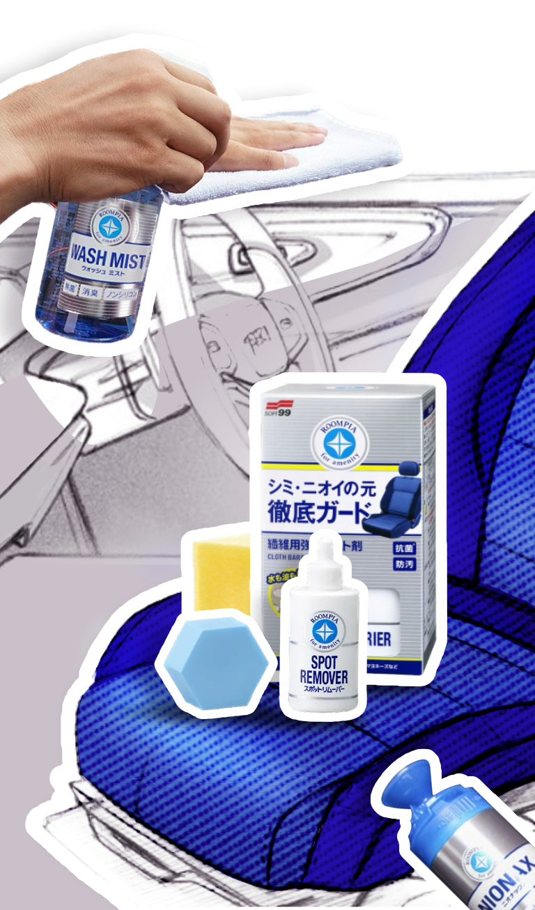 SOFT99 Roompia — нова лінійка для догляду за тканинними салонами. Наразі вона складається з чотирьох продуктів: захисного покриття для тканини, засобу для виведення плям, нейтралізатора запахів і універсального очищувального спрею.