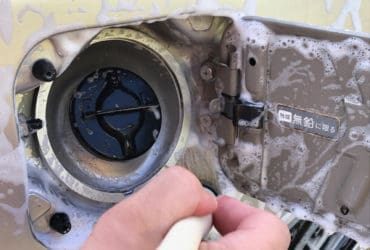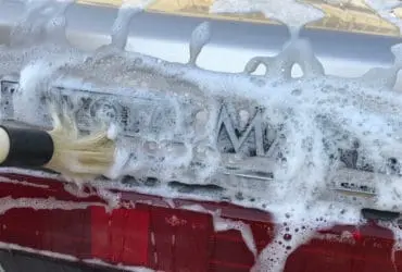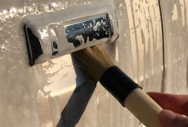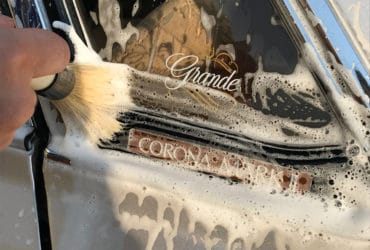 Нанесіть на кузов низьколужну піну для безконтактної мийки. Візьміть пензель із м’яким ворсом і ретельно очистіть усі щілини та важкодоступні місця кузова: значки, молдинги, ручки, люк бензобака, ущільнювальні гумки, отвори. Змийте піну струменем з АВТ.