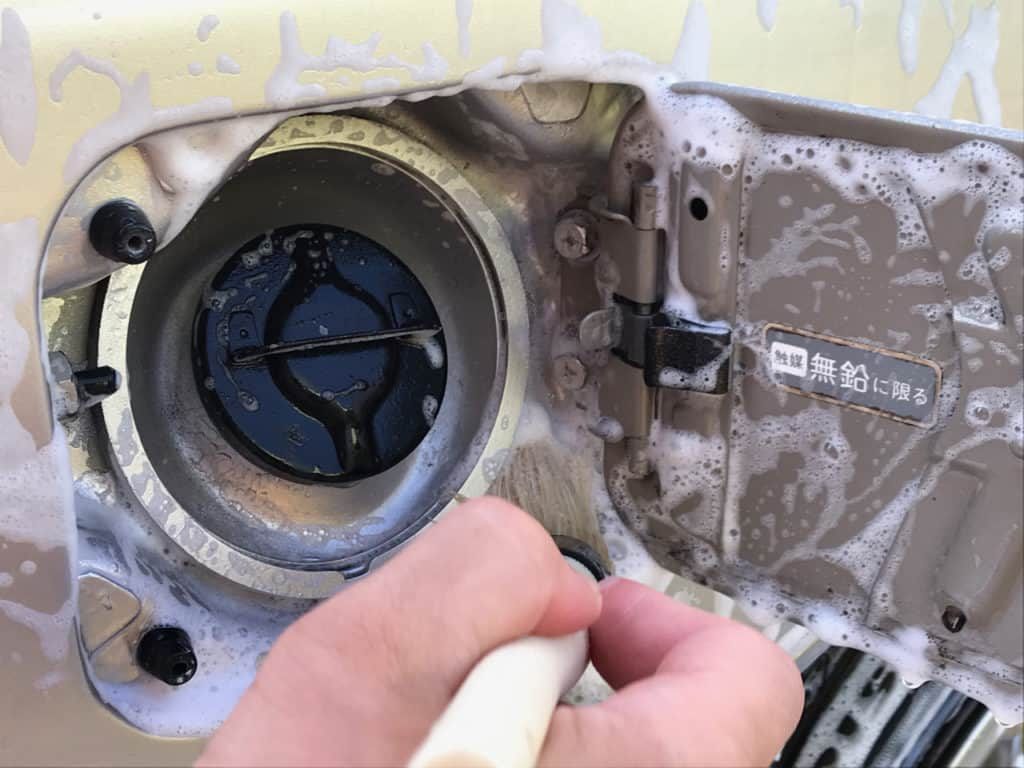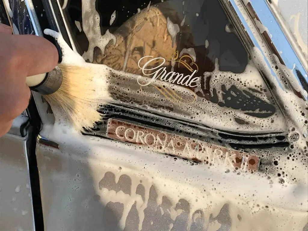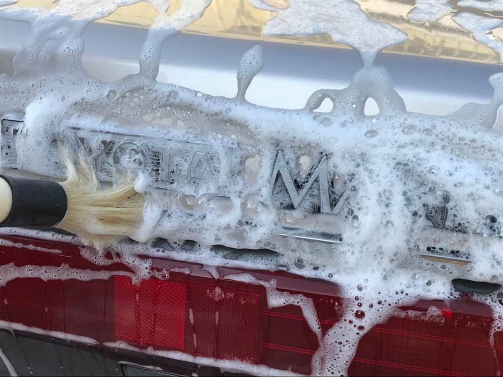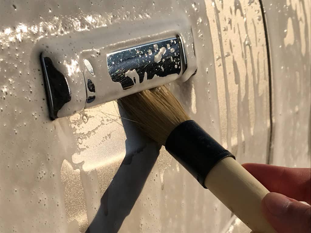Нанесіть на кузов низьколужну піну для безконтактної мийки. Візьміть пензель із м’яким ворсом і ретельно очистіть усі щілини та важкодоступні місця кузова: значки, молдинги, ручки, люк бензобака, ущільнювальні гумки, отвори. Змийте піну струменем з АВТ.