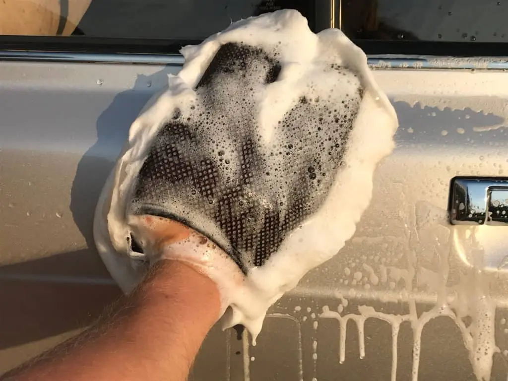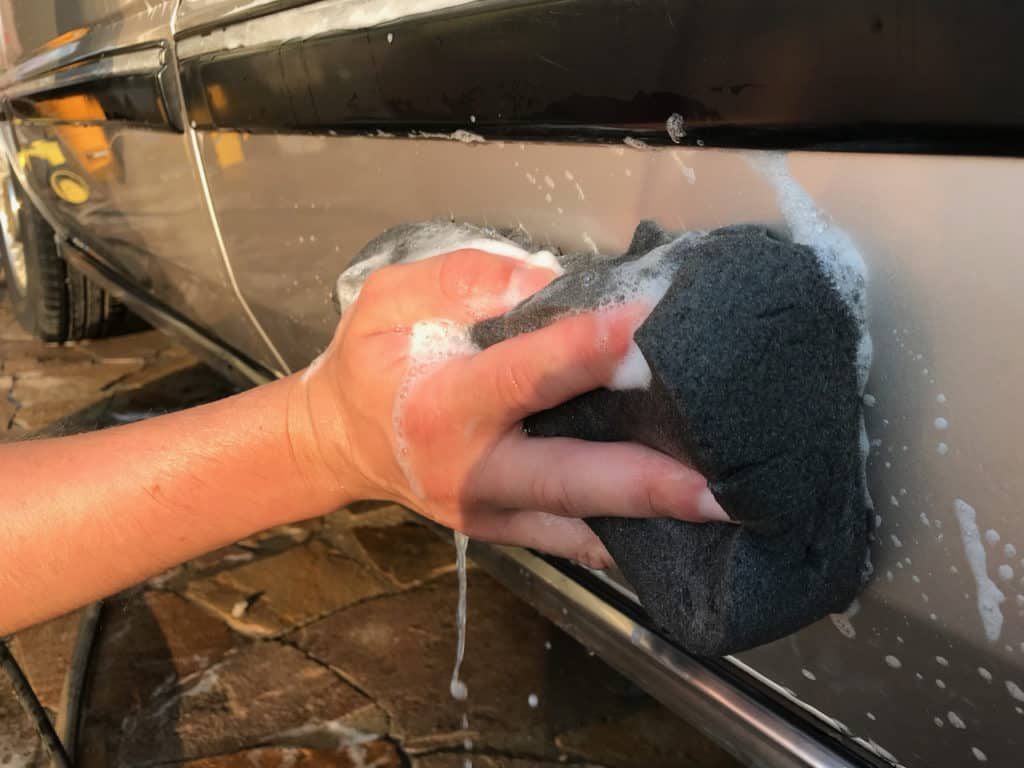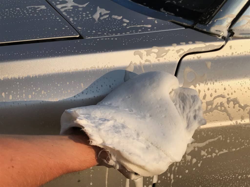 Рухи під час миття автомобіля мають бути прямолінійними. Після двох-трьох проходів по фрагменту кузова мочалку потрібно обполоснути у відрі з чистою водою. Зауважте, що мити потрібно не мильною водою, а піною, яка утворюється на поверхні мильного розчину. Піна виступає в ролі подушки, яка не дає змоги контактувати мочалці й абразивам, що залишилися на ЛФП.
