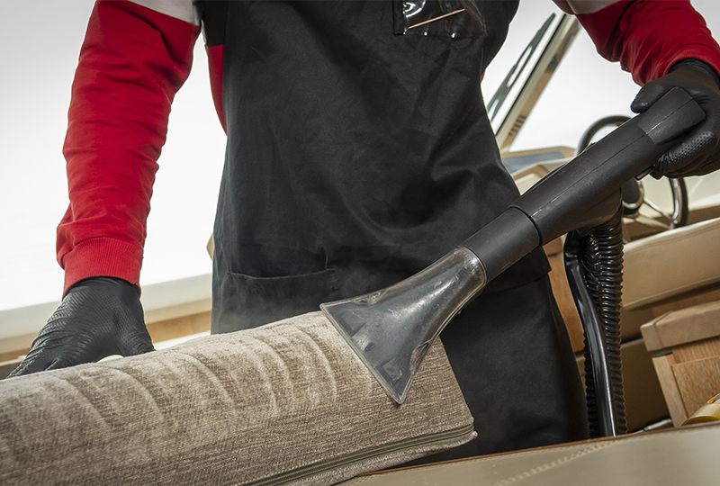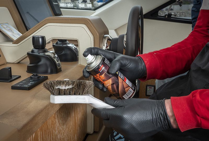 Отдельное внимание нужно уделить поверхностям из кожи. Помимо загрязнений, она подвержена негативному воздействию ультрафиолета и морской соли — может выгорать, пересыхать и трескаться. Кожаные элементы на борту яхты мы сперва очищаем, а потом покрываем специальными защитными составами, позволяющими сохранить их мягкость, естественную матовость и в разы продлить срок службы.
