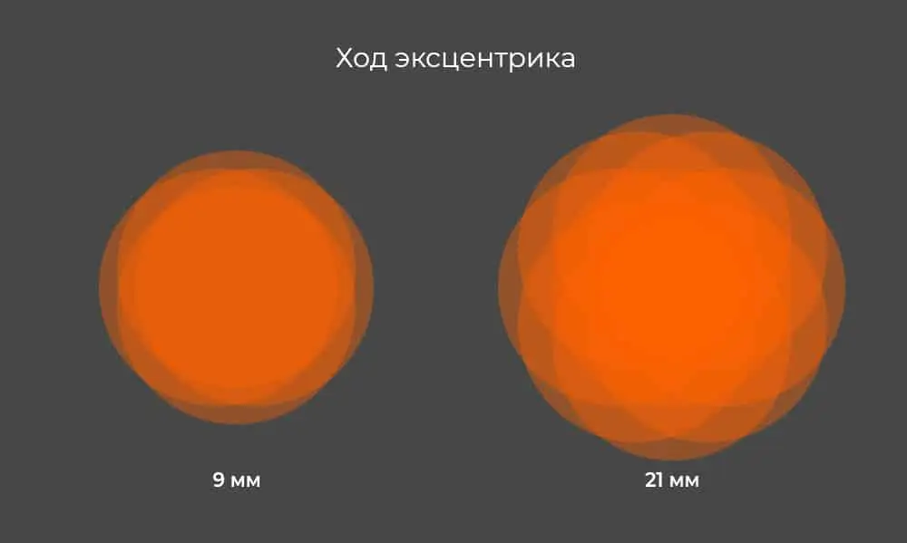 Чем больше ход эксцентрика, тем больше площадь воздействия и тем меньше нагрев поверхности. Полировальные устройства с ходом эксцентрика до 12 мм могут использоваться для шлифовки.