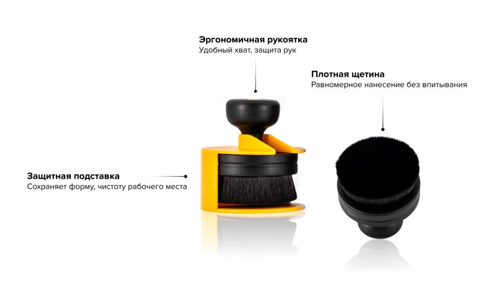 Аппликатор равномерно наносит чернение для шин. Вместо поролона используется густая синтетическая щетина, которая не впитывает состав, а точно распределяет его по поверхности. Гибкие щетинки легко проникают в труднодоступные участки, включая сложные рисунки протектора.