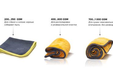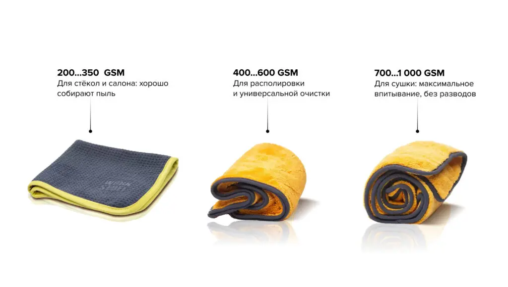 Микрофибры с низкой плотностью (200–350 GSM) – гладкие и плотные, подходят для очистки стёкол и работы с интерьером. Средняя плотность (400–600 GSM) – универсальный вариант для располировки и удаления остатков средств. Высокая плотность (700–1000 GSM) – мягкие, пушистые полотенца, идеально впитывают влагу, обеспечивая быструю сушку без разводов.