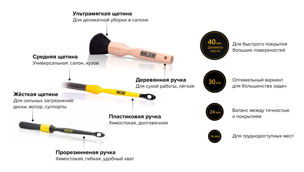 - Каждая кисть предназначена для конкретных задач автомойки и детейлинга