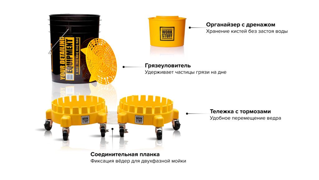 Вёдра Work Stuff объемом 20 литров оснащены грязеуловителем, который предотвращает попадание песка и грязи обратно на губку или варежку. Специальная решётка на дне задерживает загрязнения, снижая риск появления царапин на лакокрасочном покрытии.